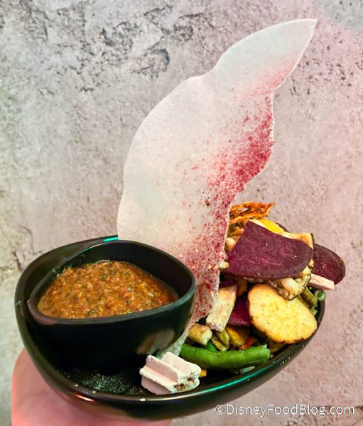 We also got a little peckish during our time in the cantina, so we ordered up some Batuu Bits. These are described as “Crispy Galaxy Snack Bits with Spiced Chermoula Dip.” Honestly, our reporters have mixed thoughts on this snack. But the reporter today happens to love the snack mix and dip. It’s got a fun kick, but it’s not TOO spicy. There are lots of dried veggies and were all seasoned well. Each little bite has its own unique flavor — and the spiciest are the lotus root bits.