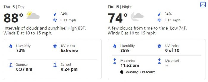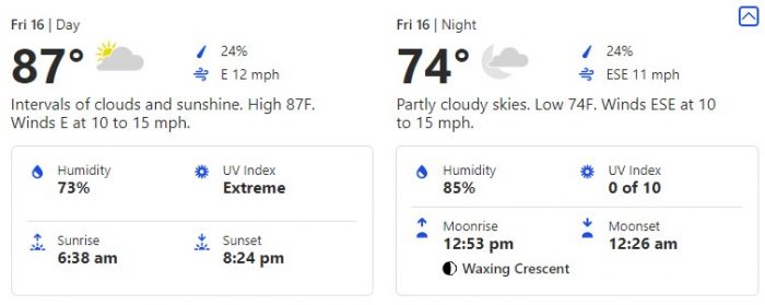 The next day, July 13th brings us a slightly cooler forecast to the day before with a high of 87 degrees during the day and a low of 76 degrees.