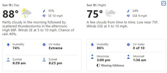 And we’ll wrap up our week on July 18th with about the same temperatures we’ve been seeing in this forecast and similar conditions. Get ready for high humidity and UV levels and afternoon showers.