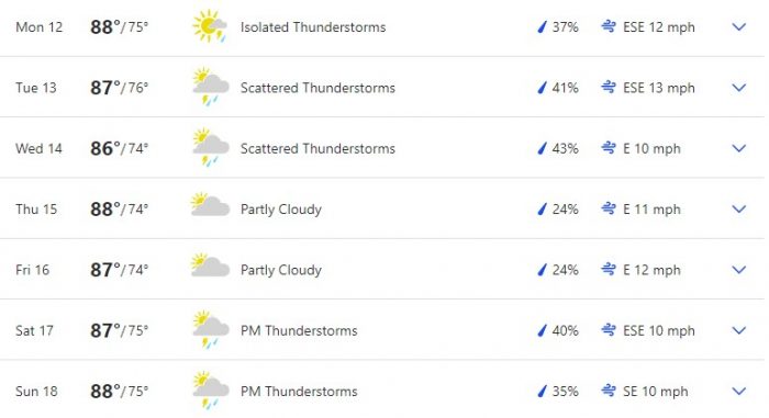 Here is a full overview of the week according to The Weather Channel. Temperatures are projected to hang out in about the same place for the whole week. We’re looking at a range of 80s highs and 70s lows.