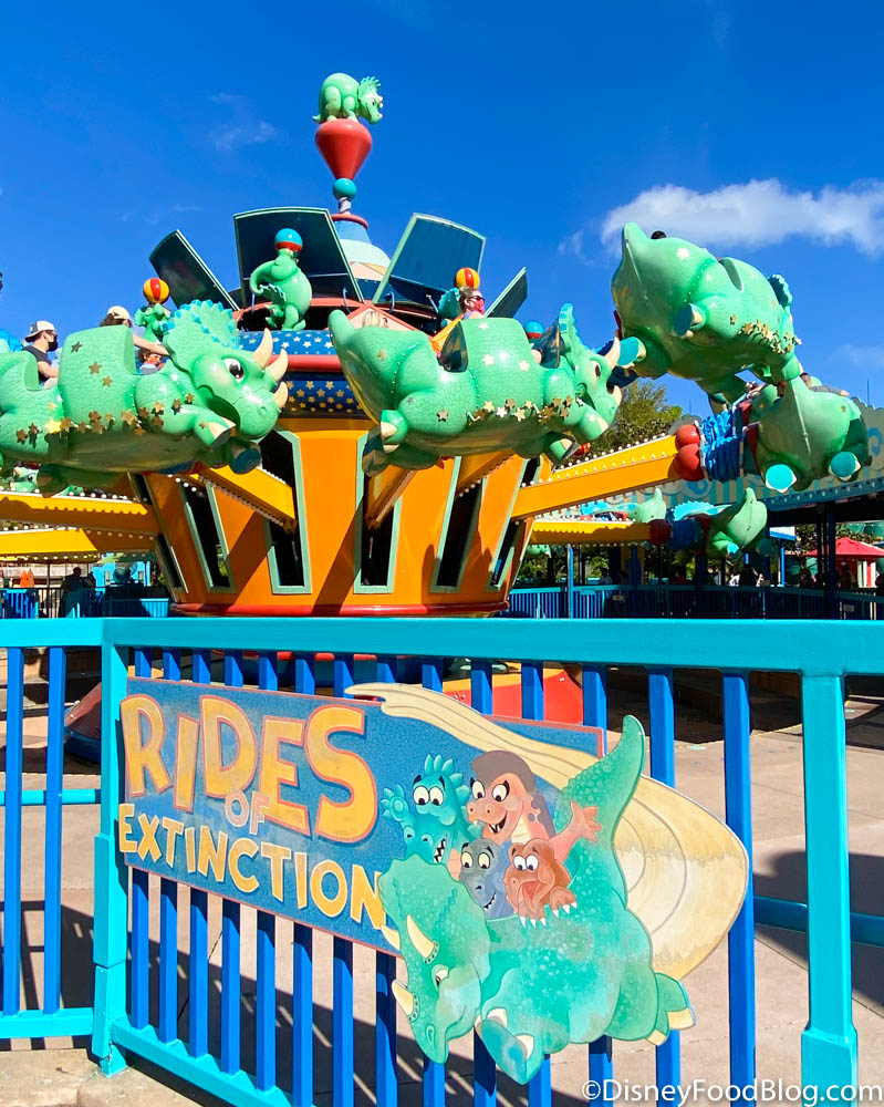 Triceratops Spin’s partner-in-crime, The Primeval Whirl, is no longer in operation — leaving it to be the soul survivor of the carnival stylings in this park. If you need to calm down after losing your money to one of the numerous carnival games scattered around Dinoland, then this might be the ride for you! There’s not much to it, but there’s also no line to it, either!