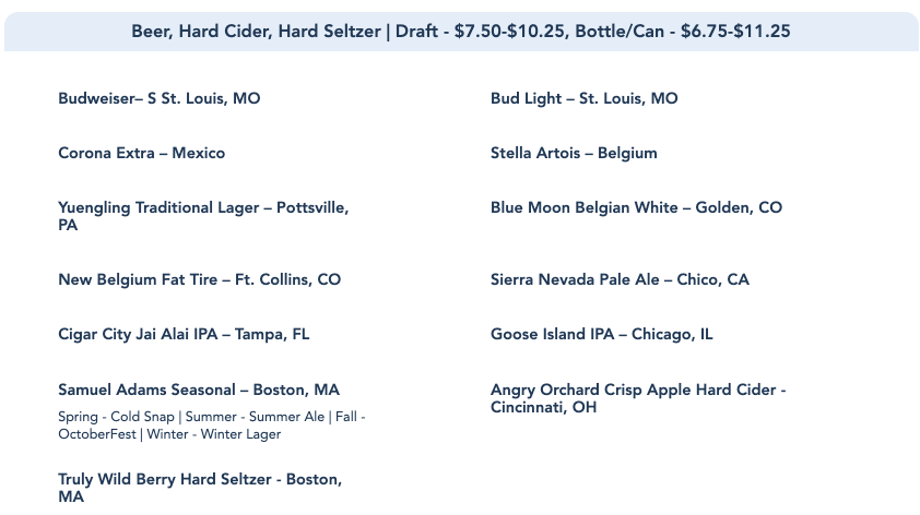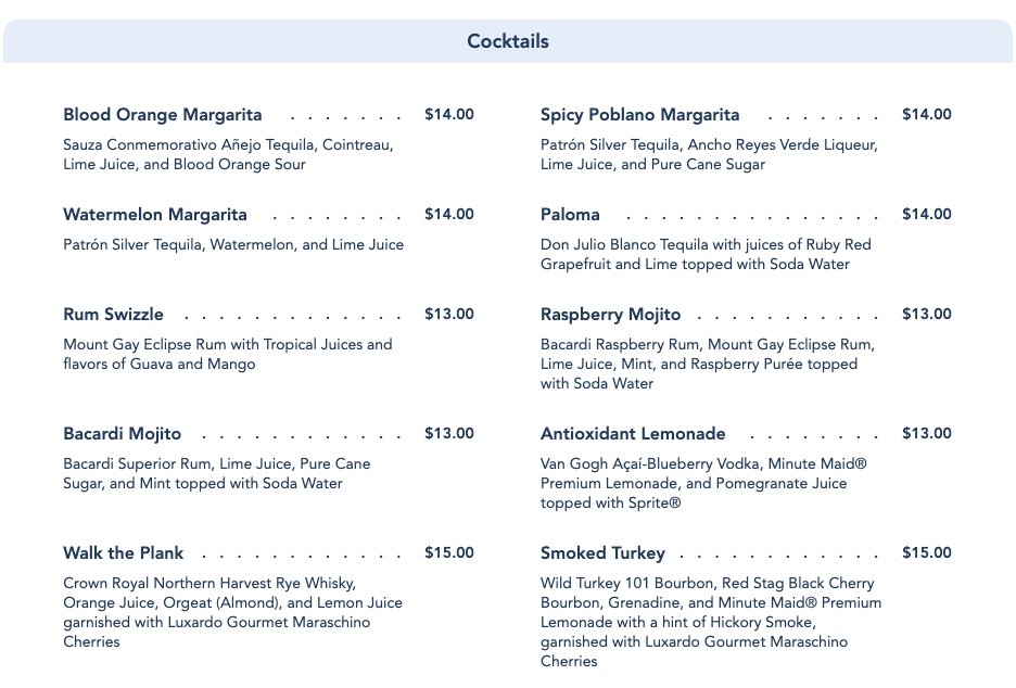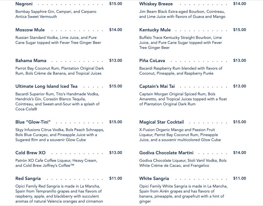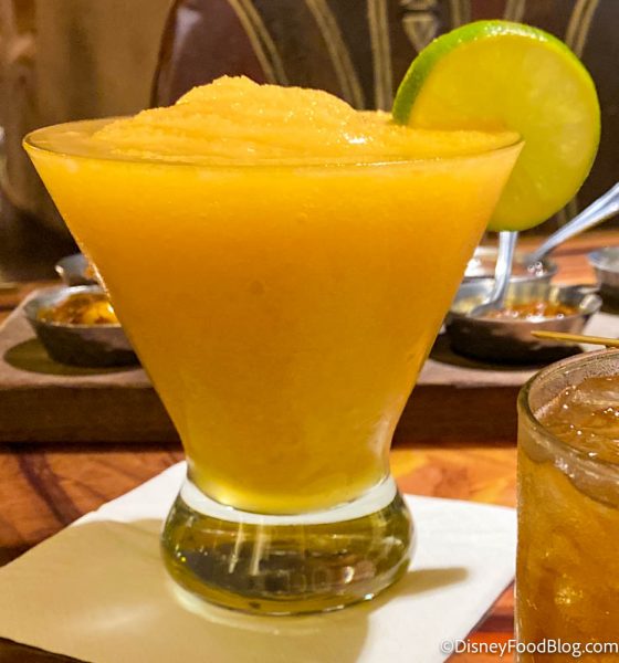 This margarita is a frozen blend of Tequila, Van der Hum Tangerine Liqueur from South Africa, Mango Puree, and fresh lime juice. We thought it was super refreshing — an awesome pick if you’ve spent a hot day in the parks and need to cool down! There was a strong fruity taste, but it wasn’t too sweet, and the alcohol taste wasn’t overwhelming.