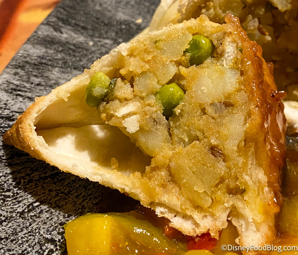 We really enjoyed the whole dish! The samosas were served warm, and they were as crunchy as they look! The crisp pastry was a great contrast to the filling, which was a potato mash with a few peas.