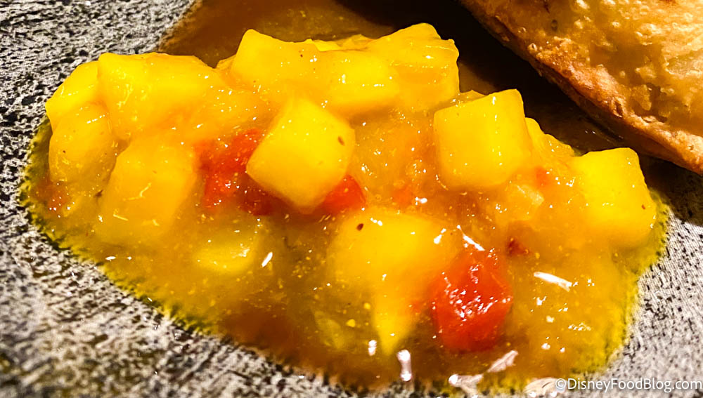 These are Potato and Pea Samosas, and they’re served with Tamarind and Mango Chutney (recognize those from the bread service sauces??). They’re also served with a pickled carrot and papaya atchara slaw!