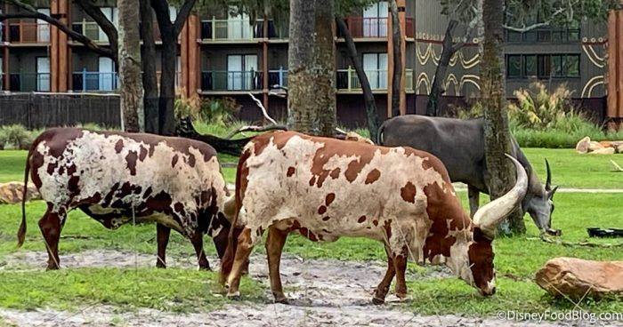 When we went out, we saw several Ankole cattle pretty close up — look at the size of their horns! A cast member informed us that the horns are made of a honeycomb-like structure inside, so they’re not quite as heavy as they look! In Sanaa there are tables right next to the windows so guests can watch the animals while they eat (one of our favorite things about this location aside from the phenomenal food!), but the Sanaa Lounge doesn’t have Savanna views, so make sure you visit the lookout before or after you go to see the animals while you’re there!