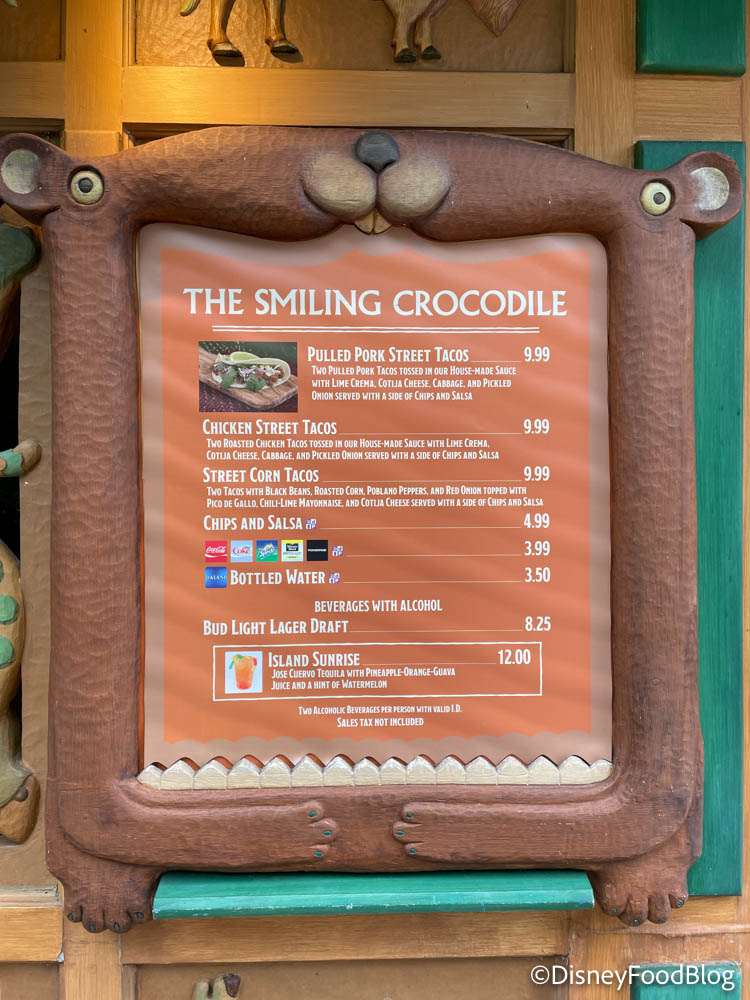 The Smiling Crocodile is back open in Animal Kingdom! 🐊 We’re trying the Chicken Street Tacos, the Street Corn Tacos and an Island Sunrise. pic.twitter.com/Q0oFJtxnWD