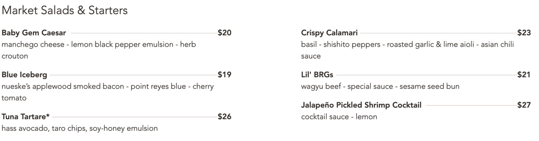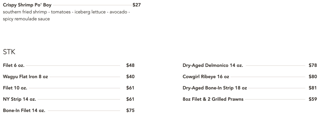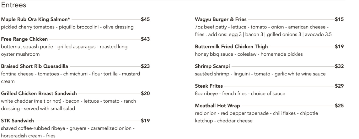 The Entree menu is pretty beefy (see what we did there?) with primarily lots of sandwich-style options. If you didn’t figure out their schtick with the name STK, it’s apparent in their STEAK options (Get it?? It’s like their keyboard broke or all the vowel keys had crumbs stuck under them!). That’s the star of the show here. You’ll notice the “we forgot how vowels go in sentences” speak on other spots on the menu as well. 🙂