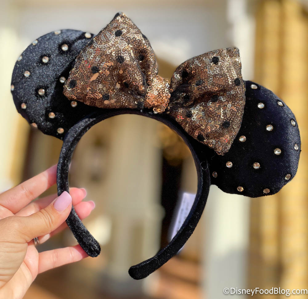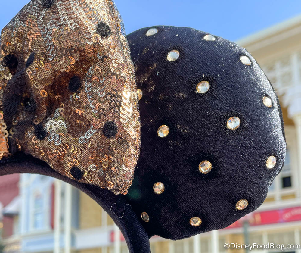 The ears are black velvet with gold rhinestones in the ears and a bronze sequin bow that has black polka dots!