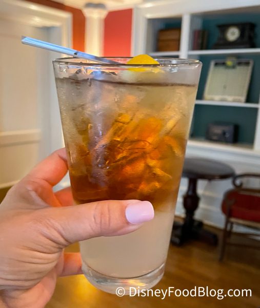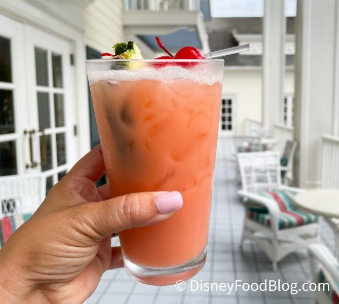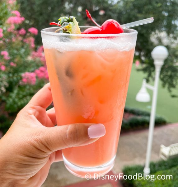 Finally, we tried out the Bee Drop, named after a Cast Member there named Beatrice! This drink is a slight twist of their Bahama Mama, and is a mixture of Parrot Bay, Plantation Dark Rum, Pineapple Juice, and Grenadine with a splash of Pina Colada Mix.