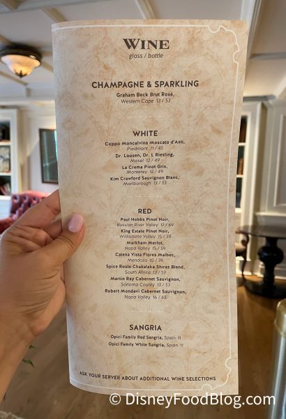 We grabbed a paper menu to take a look at our options, which included their selection of wine…