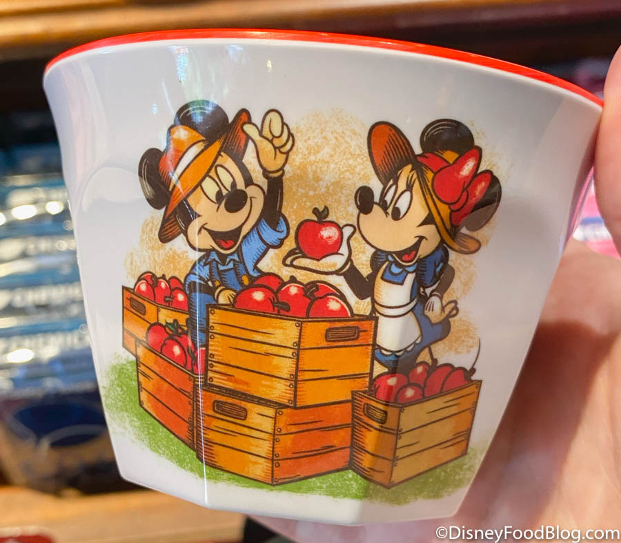 This Apple Orchard Mug has a front and back design for $19.99, with Mickey and Minnie on the front…