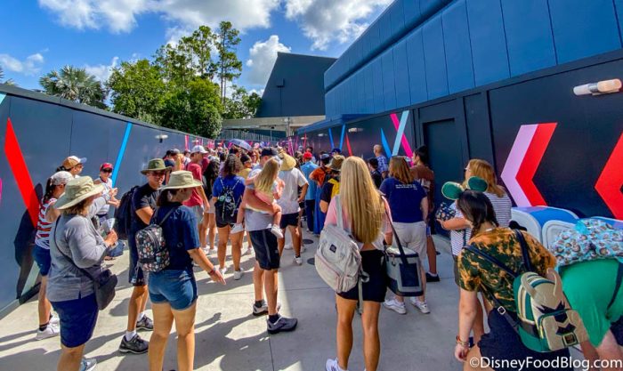 We arrived at EPCOT’s two entrances well before the parks officially opened, and the crowds were already there. As we waited to go inside, the lines got significantly backed up. (But that’s to be expected at rope drop!)