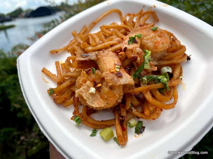 Finally, we have the Crispy-fried Pepper Shrimp with Spicy Sichuan Noodles. This is similar to, but slightly different than, the shrimp dish we saw served at this booth at the 2019 Food & Wine Festival. Back in 2019, the dish was described as Black Pepper Shrimp with Garlic Noodles, and it actually made our list of the items you must get from each booth.