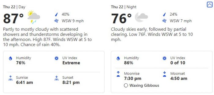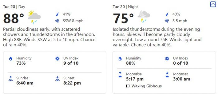 The next day, July 20th brings us a slightly cooler forecast to the day before with a high of 88 degrees during the day and a low of 75 degrees.