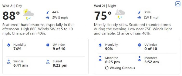 On Wednesday, July 21st, we’re going to see temps hang out in about the same place at 88 degrees during the day and 75 degrees at night.
