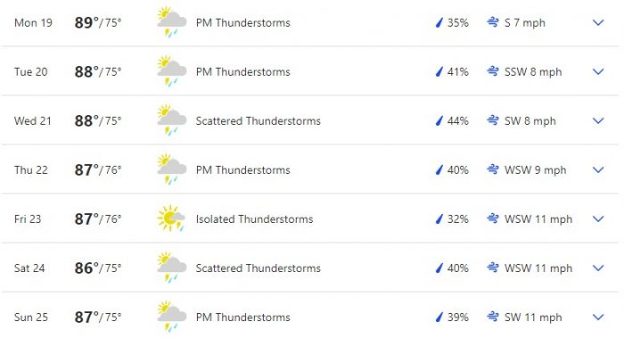 Here is a full overview of the week according to The Weather Channel. Temperatures are projected to hang out in about the same place for the whole week. We’re looking at a range of mid to high 80s highs and mid 70s lows.