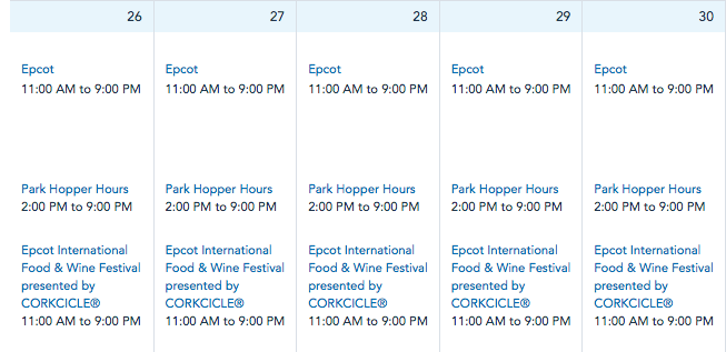EPCOT will be open from 11AM to 9PM from September 26th through the 30th…