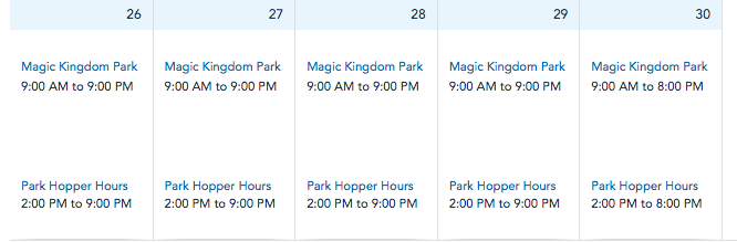 From September 26th through the 29th, Magic Kingdom will be open from 9AM to 9PM. It will then be open from 9AM to 8PM on September 30th.