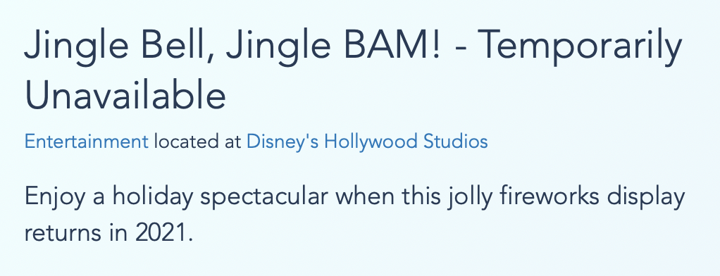 Jingle Bell, Jingle BAM! was canceled for 2020, and while Disney’s website still lists it as “temporarily unavailable,” it also mentions a return for the show in 2021.