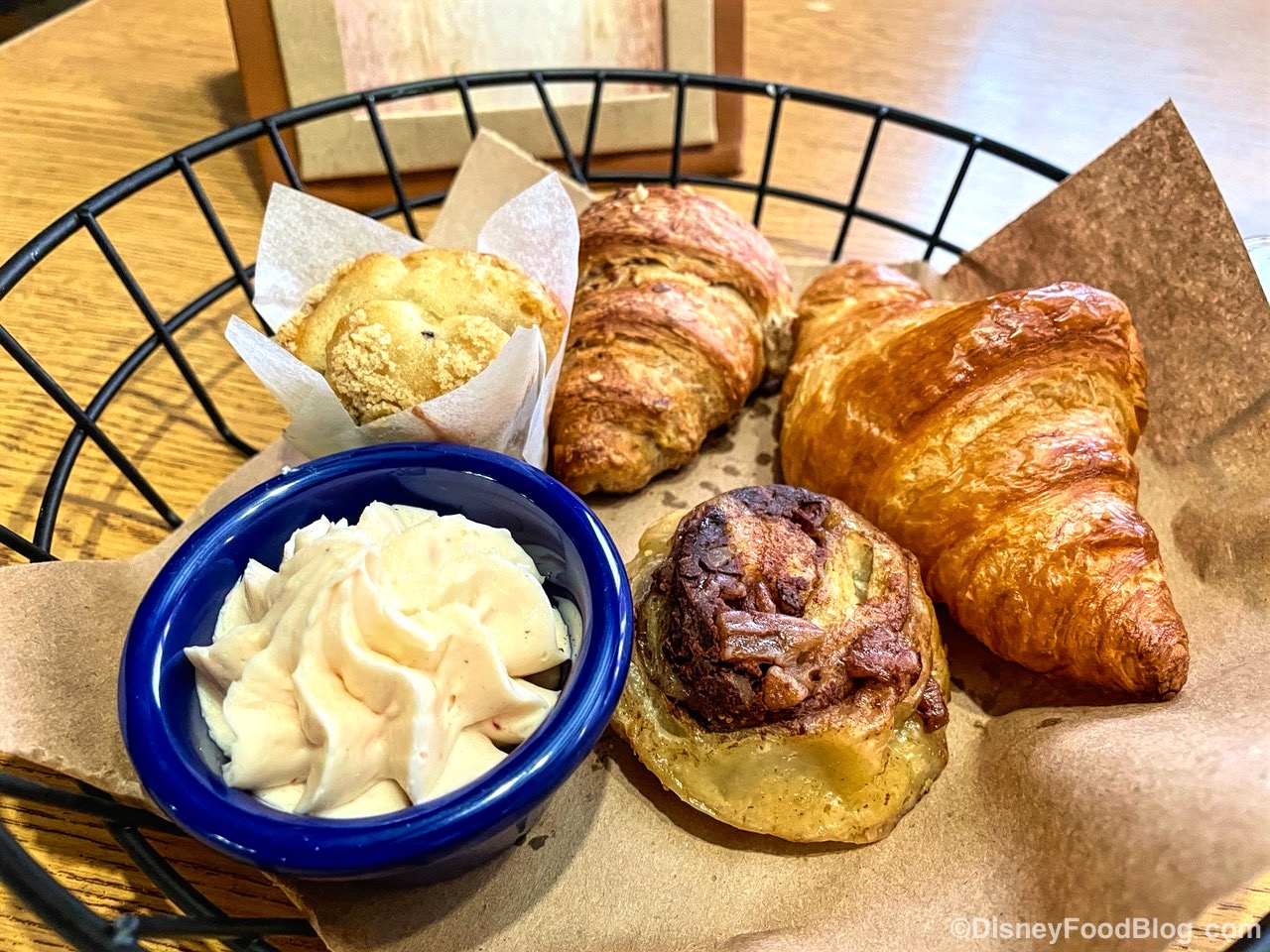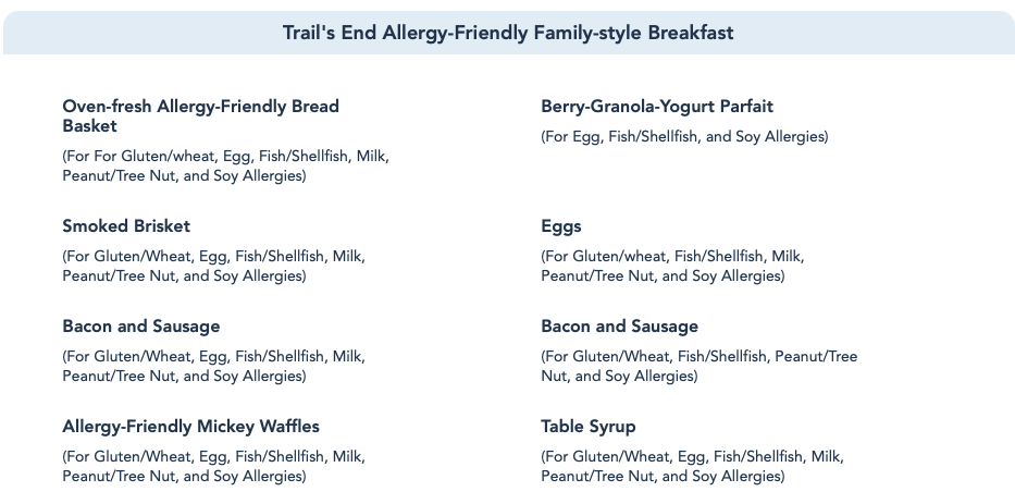 You might already know that Trail’s End has a new family-style menu, which they announced last month. Just like the old buffet, you’ll pay a flat fee to dine here, costing $19.99 per adult and $11.99 per child. This updated menu includes a Pastry Basket, Berry-Granola-Yogurt Parfait, and a Breakfast Skillet for the table! The Breakfast Skillet has Smoked Brisket and Eggs, Mickey Waffles, Bacon and Sausage, and Cheesy Potato Casserole. There were a lot more options when Trail’s End breakfast was a full buffet, like the Pulled Pork Benedict and Breakfast Pizza, just to name a couple of missing items.