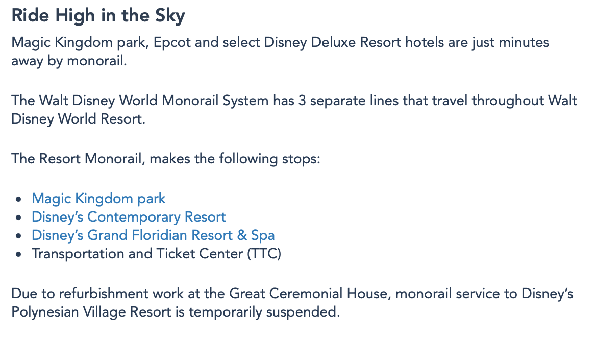 However, other transport options like buses, walking paths, etc. would still be available! If you’re looking to ride the Monorail while you’re at the Polynesian, head over to the Transportation and Ticket Center or the Grand Floridian Resort Monorail Stations, both are within walking distance!