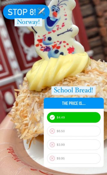 Okay, time for another stop for a treat (is anyone surprised?). Kringla Bakeri og Kafe is over in the Norway Pavilion and here you can find the School Bread topped with Olaf from Disney’s Frozen. And, it looks like most of our readers thought that you’d be paying a premium for the Disney Character-topped treat because the majority guessed that it cost $6.50 and only 25% knew that it costs $4.49.