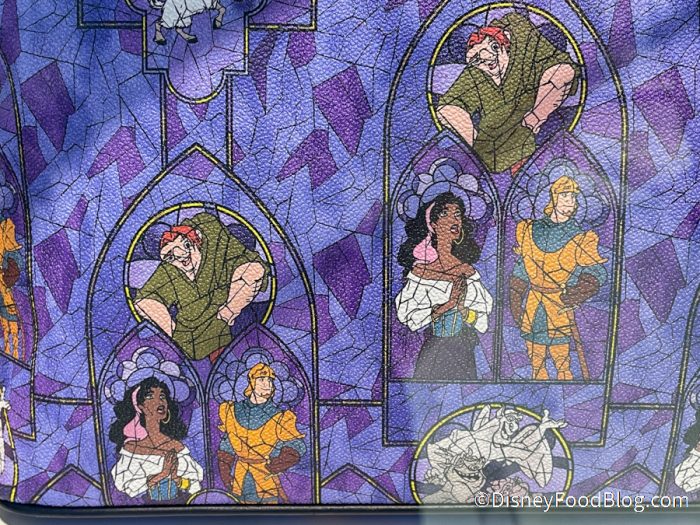 The purple bags feature a pretty stained glass pattern with Esmeralda, the Gargoyles, Quasimodo, Phoebus, and Djali!