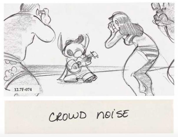This image is one of the pictures shown at the end of the 2002 Lilo and Stitch film during the credits. There will also be sketches of the animation from the film, including ones of Stitch as Elvis playing for a crowd!