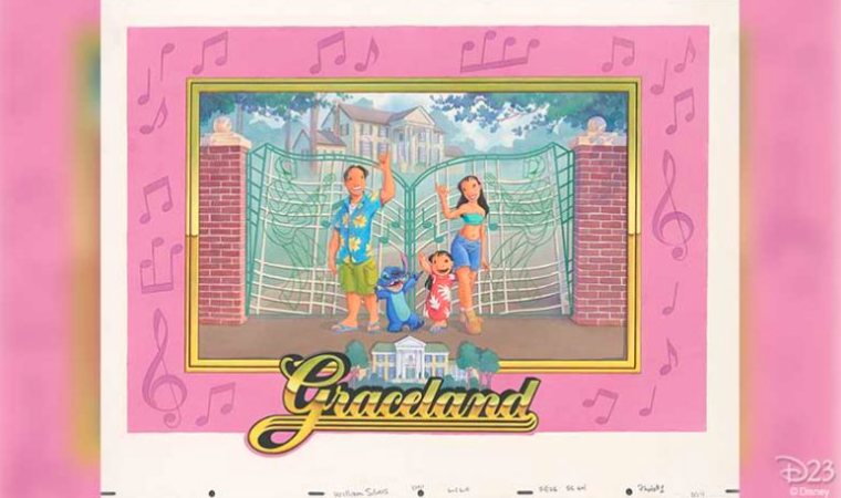 Really, what could be more fitting for a Disney exhibit in Graceland than art from Walt Disney Animation Studios’ Lilo and Stitch, especially when that art shows the Lilo and Stitch family visiting Graceland itself?