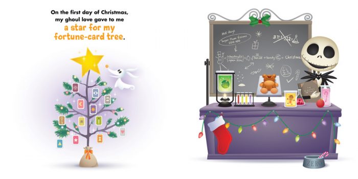 Right off the bat, we can’t help but say, “Awww” when we see Maruyama’s illustrations in Tim Burton’s The Nightmare Before Christmas: 13 Days of Christmas.