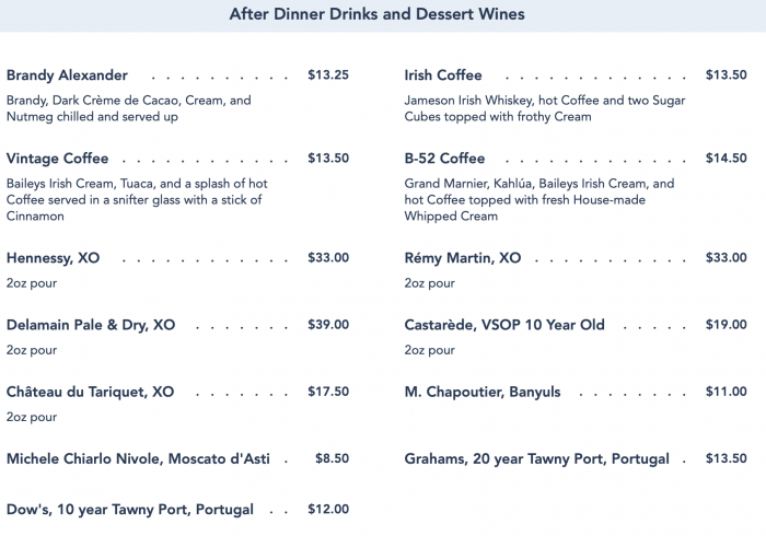 As for the After Dinner Drinks and Dessert Wines, everything has also remained the same as before. Get your Irish coffee for $13.50 or sip on a Brandy Alexander for $13.25.