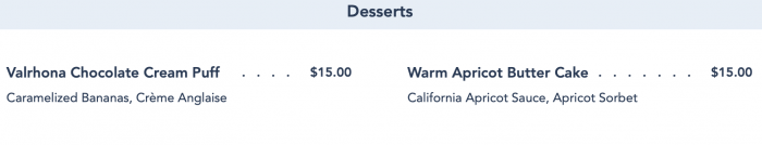 If you want something sweet, you have two new options — a Valrhona Chocolate Cream Puff for $15 and a Warm Apricot Butter Cake for $15.