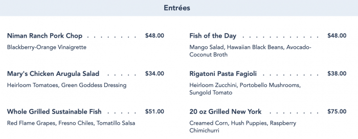 Moving on to Entrees, we only really have one returning menu item from the pre-closure menu — the Niman Ranch Pork Chop for $48, but it’s being served with a Blackberry-Orange Vinaigrette rather than the former Brown Butter Vinaigrette. There is still Sustainable Fish on the menu, but now it’s whole grilled for $51. If you’re looking for steak, there’s a 20 oz Grilled New York steak for $75 instead of the former Pan-Roasted Filet Mignon for $54.