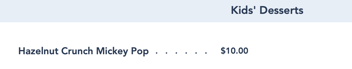 Kids also have one dessert they can get (which is new) — the Hazelnut Crunch Mickey Pop for $10.