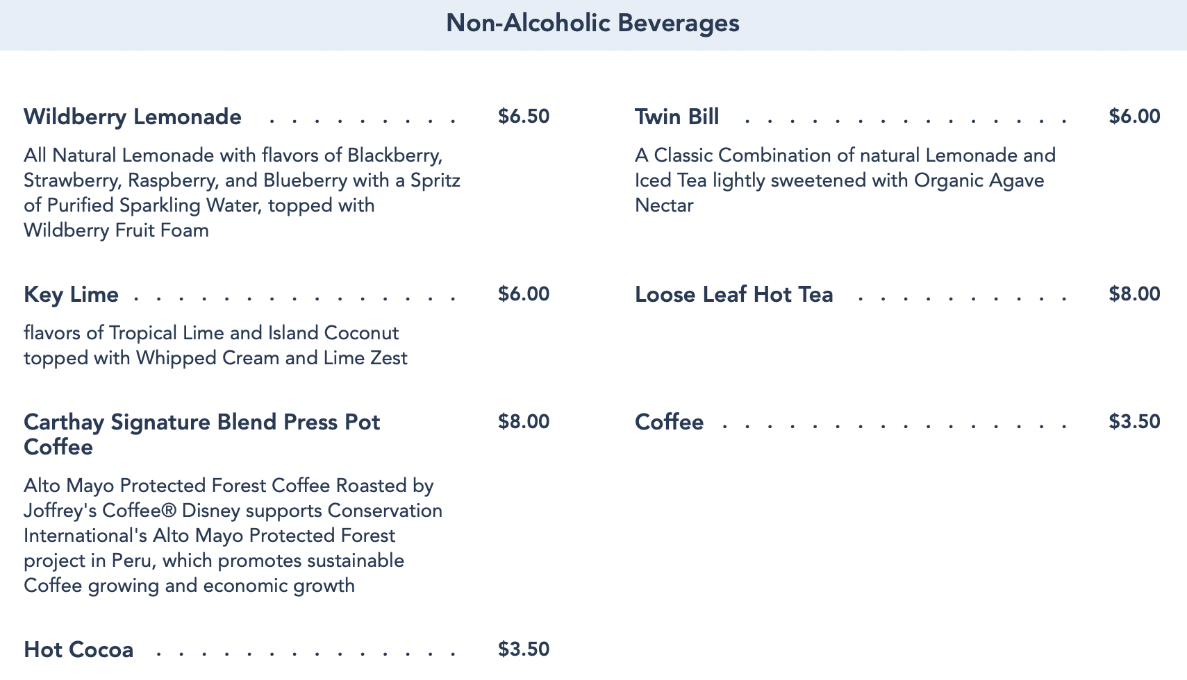 As for the non-alcohol drink menu, nothing has changed! You can still get things like the Wildberry Lemonade for $6.50, Twin Bill for $6, or Carthay’s Signature Blend Press Pot Coffee for $8.