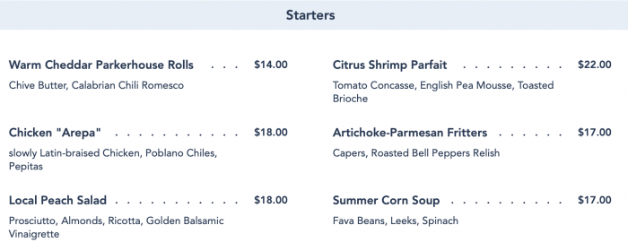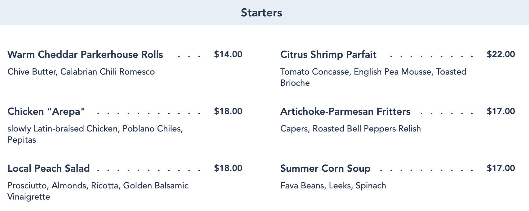 Beginning with starters, everything listed is a new item since before the closures. There are Warm Cheddar Parkerhouse Rolls for $14 instead of the Signature Fried Biscuits that used to be on the menu, along with other fun new items like a Chicken “Arepa” for $18 and Artichoke-Parmesan Fritters for $17!