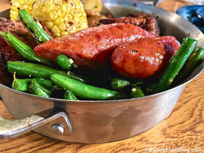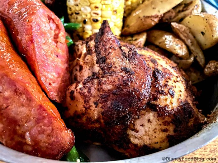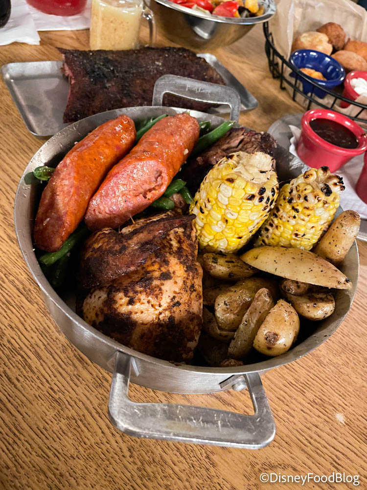 Now, for the main event: the Smokehouse Skillet with Pecan-smoked Brisket, Rotisserie Chicken, Andouille Sausage, Fingerling Potatoes, Green Beans, Buttered Corn on the Cob with Chipotle Barbecue and Carolina Mustard Barbecue Sauce (basically a whole buffet in one big bowl!).