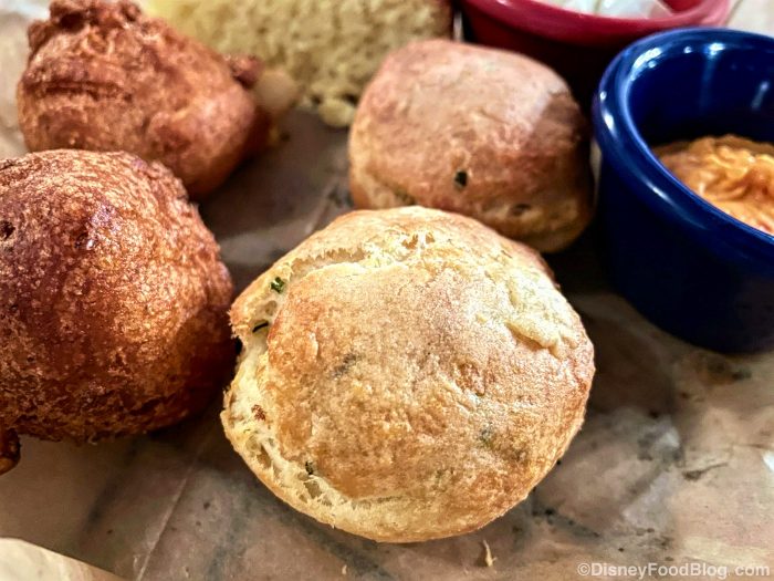 The Goat Cheese Chive Biscuits were REALLY good! They had an herby flavor and a bit of tang from the goat cheese but not so “goat cheesy” that it would turn off guests that aren’t a fan. These go great with the honey butter, but you don’t need the butter to enjoy these biscuits!