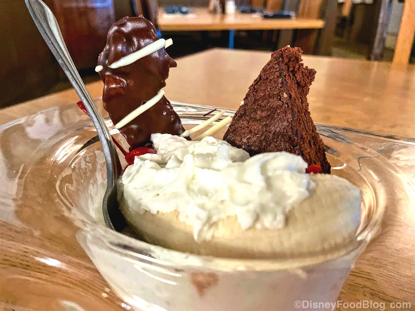 To end our dinner at Trail’s End, we got the Covered Wagon Sundae. This was 2000% the part of the meal we’d been waiting for all day! We loved the 10-gallon sundae over at Whispering Canyon Cafe at Wilderness Lodge when it was available a few years back so we were pumped to possibly see it back in action somewhat here! Served in a clear plastic cowboy hat (NOT a covered wagon, as one might expect!), this is a “Wagon Load” of Ice Cream, Toppings, Brownies, Cookies, and Chocolate-covered Bacon! If your party is just one or two people you’ll get a smaller cowboy hat, while bigger parties get the big portion.