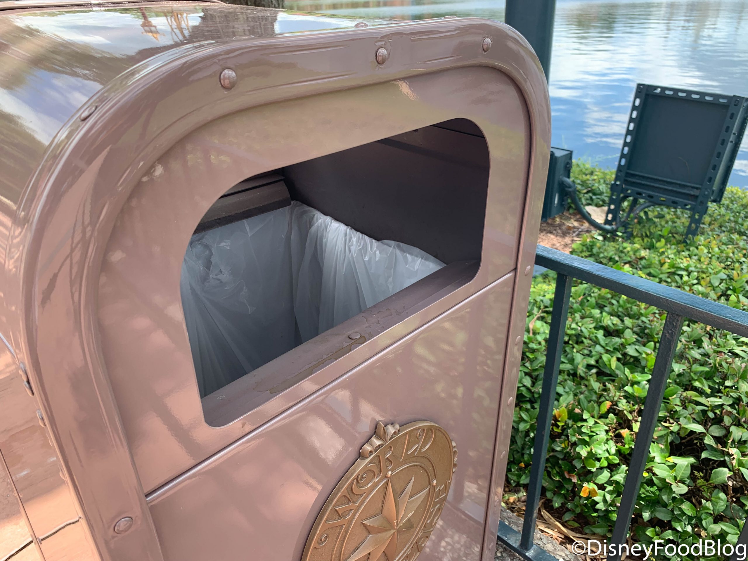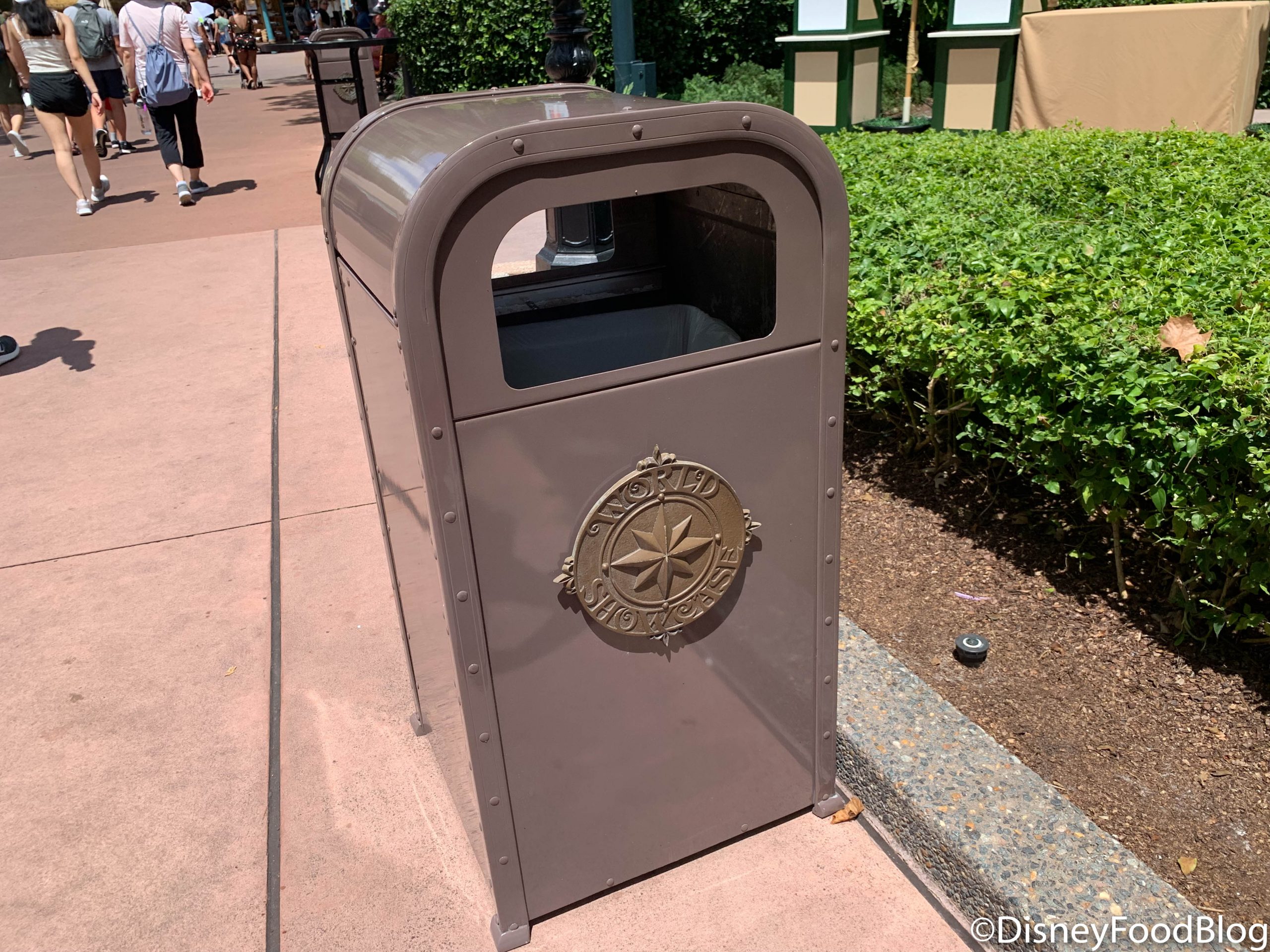 As we were strolling around EPCOT, we noticed one small change that not every guest may realize has taken place! Many of the trash cans around the World Showcase have been swapped out for models without flaps over the entrances.