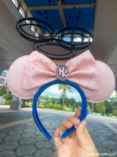 In the middle of the bow are the signature letters of Riviera Resort’s logo and the actual ears are pink glitter!! It’s tied all together with a royal blue headband to match the look of the resort.