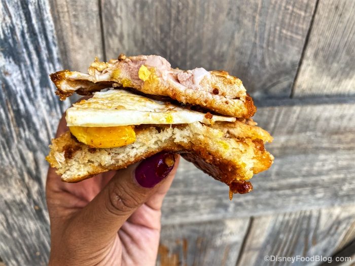 Can we really call it brunch if we don’t have a mimosa? And can it really be a brunch at Disney if we didn’t get the Dole Whip Mimosa? We ordered the Frozcato Mimosa, which features Dole Whip Pineapple, Moscato, and Prosecco.
