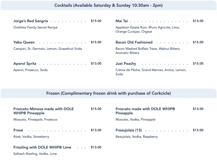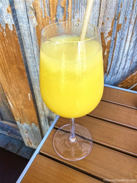 The drink is basically a bubbly Dole Whip (we’re not complaining, we love a good Dole Whip!). If you’re a big fan of pineapple and aren’t looking for a strong booze flavor in your cocktails, this one is for you! Keep in mind that — like a Dole Whip — this is SWEET. If you’re looking for a drier tasting way to sip your bubbly, they have traditional mimosas as well. 🙂 You can get this drink for $15.