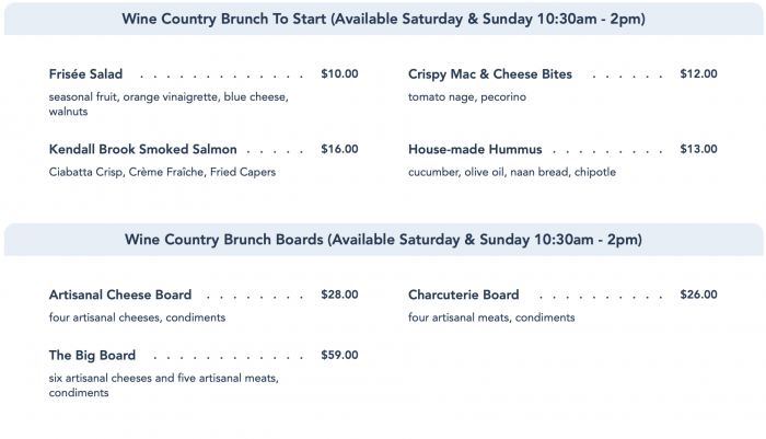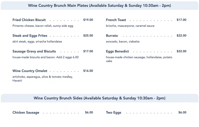 One of the major differences between the lunch and the brunch offerings is the different selection of entrees (breakfast items like the French Toast, Eggs Benedict, and Sausage Gravy and Biscuits are exclusive to the Wine Country Brunch). Brunch is only offered on the weekends and it features delicious appetizers and boards…