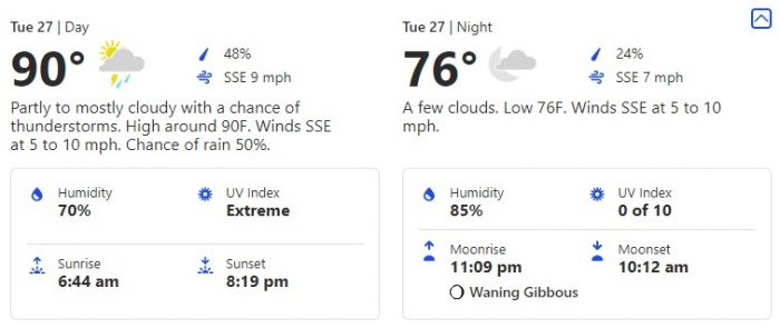 The next day, July 27th brings us the exact same temperatures as the day before with a high of 90 degrees during the day and a low of 76 degrees.