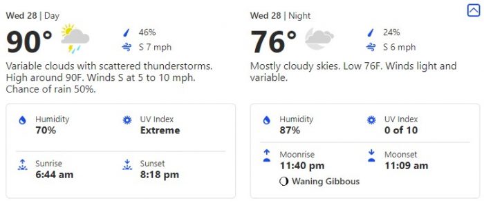 On Wednesday, July 28th, we’re going to see temps hang out in about the same place at 90 degrees during the day and 76 degrees at night yet again.
