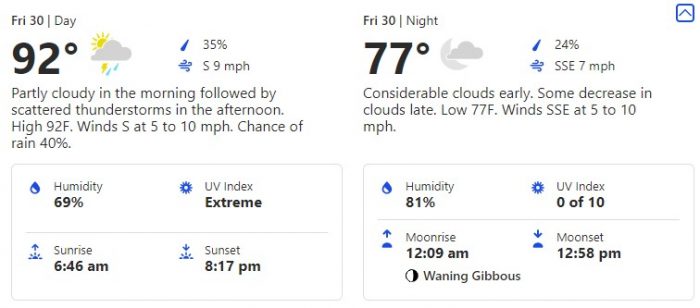For Thursday, July 29th, we’re seeing ANOTHER similarly conditioned day. Expect temps in the 90s and a beautiful evening at 76 degrees.
