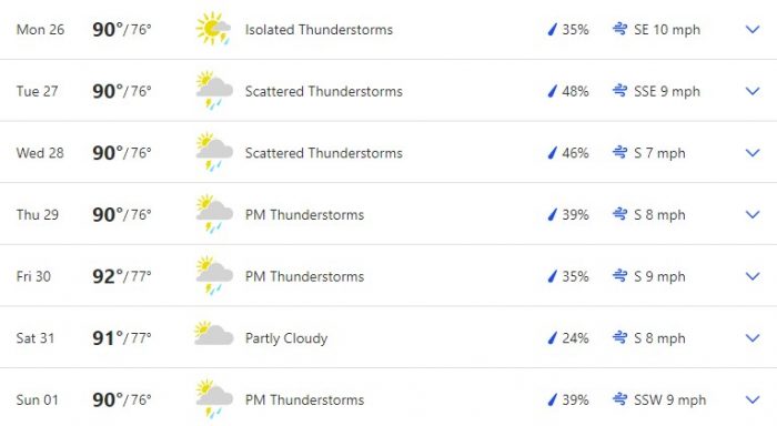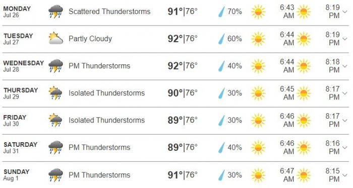 Here is a full overview of the week according to The Weather Channel. Temperatures are projected to hang out in about the same place for the whole week. We’re looking at a range of low 90s highs and mid to high 70s lows.