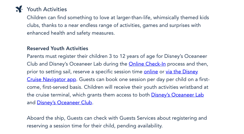 Teen and Tween clubs will be available — no reservations required. The “it’s a small world” nursery! will be temporarily unavailable.