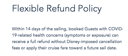 What if a guest starts to feel sick a few days before their sailing? According to the Disney Cruise Line policy, if a guest has COVID-19 related health concerns (symptoms or exposure) within 14 days of the sailing, the guest can get a full refund or apply the cruise fare toward a future sailing.